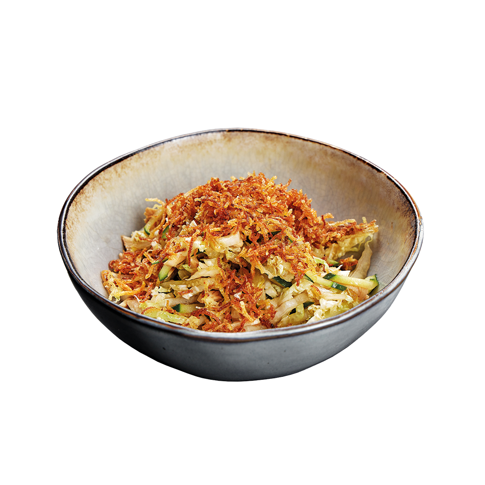 Обжаренное куриное филе со свежим огурцом, пекинским салатом и хрустящим картофелем пай, заправляется соевым соусом и луковым маслом.