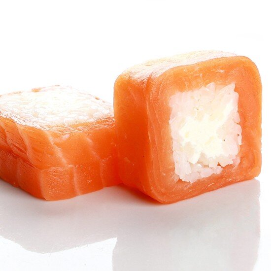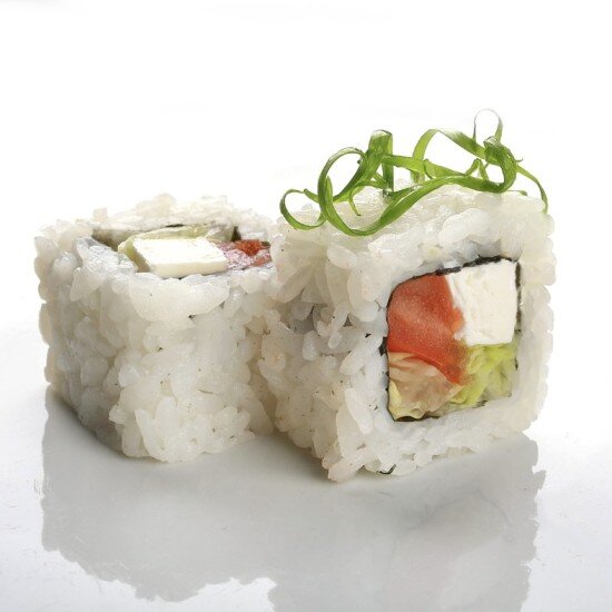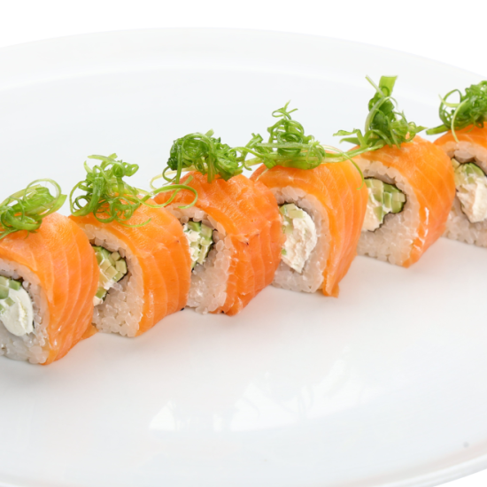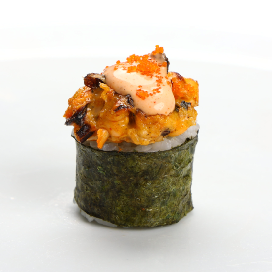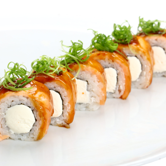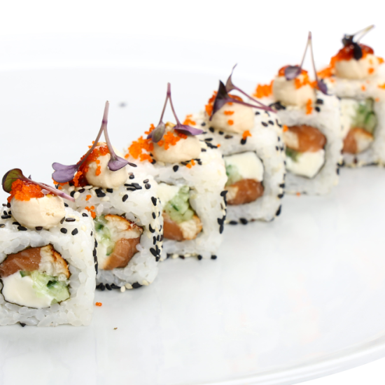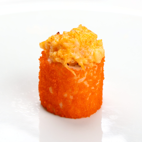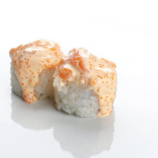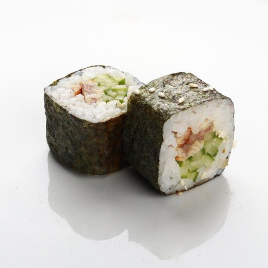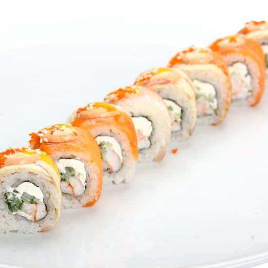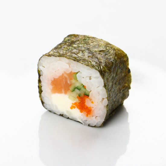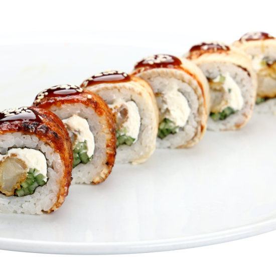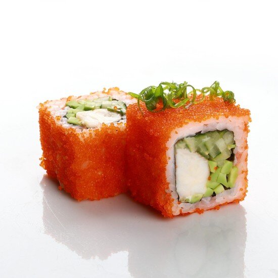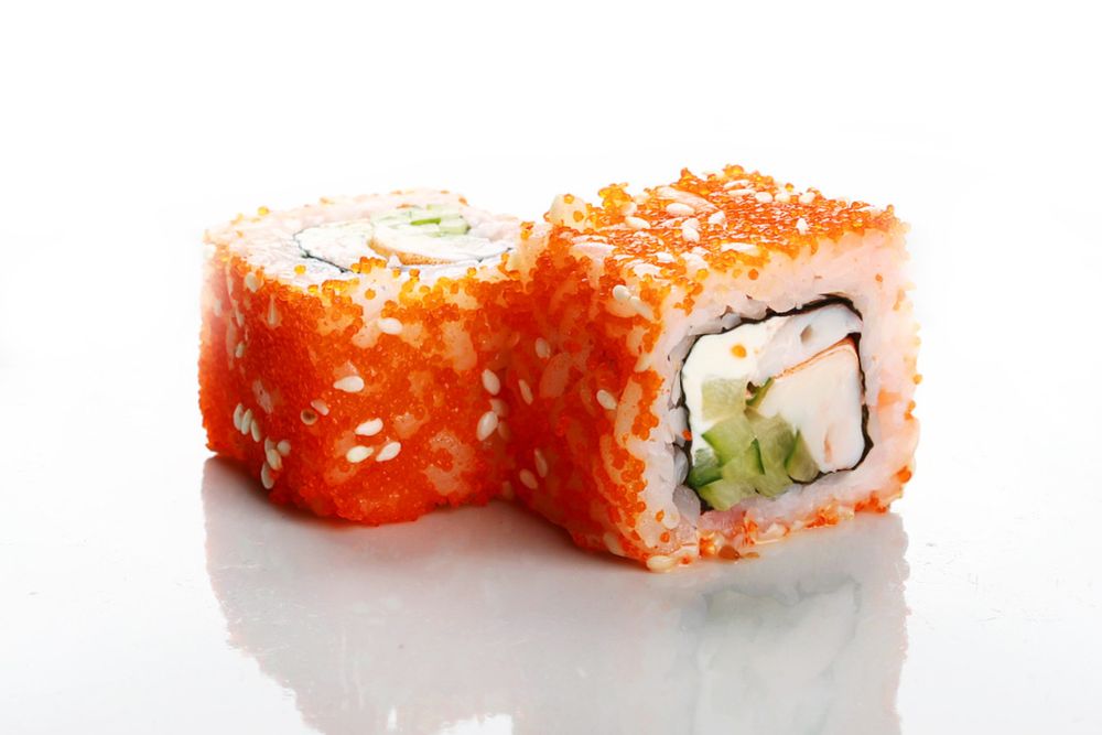 Ролл с тигровой креветкой, свежим огурцом и сливочным сыром, в икре масаго и белом кунжуте.