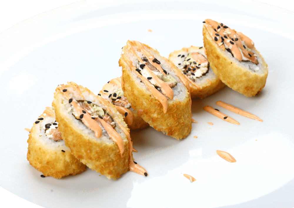 Теплый ролл с копченым и охлажденным лососем, сливочным сыром и авокадо. Сервируется соусом кимчи и кунжутом.