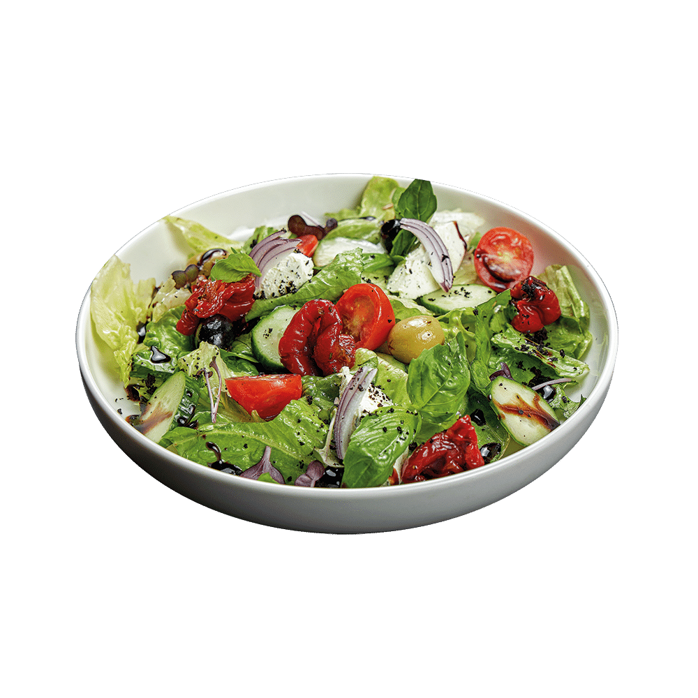 Листья салата, сливочный сыр с соусом песто и свежей мятой, помидоры черри, огурец, маслины и оливки, вяленый болгарский перец, крымский лук, заправляется соусом на основе оливкового масла, бальзамического уксуса и итальянских трав.